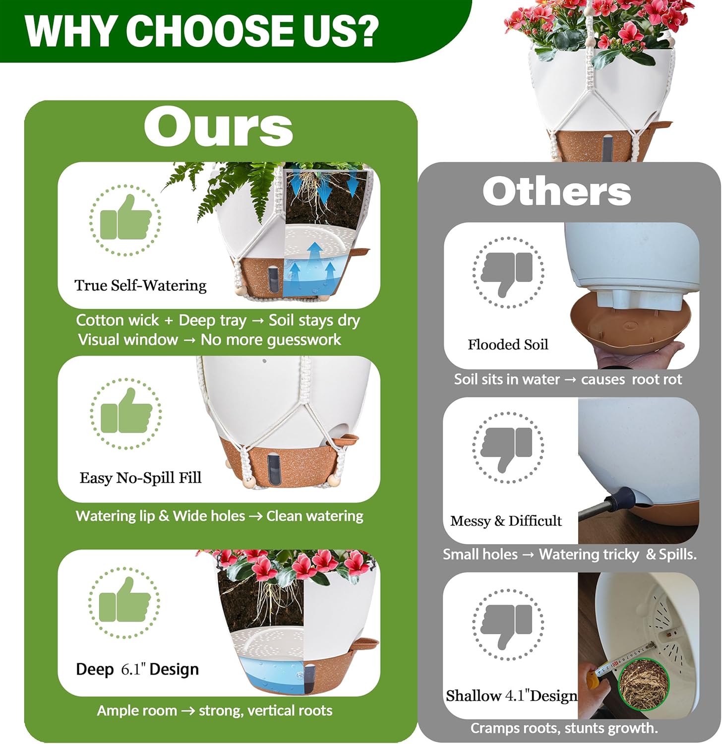 - 【Healthy Roots, Happy Plants】Our hanging planters feature GRID DRAINAGE HOLES at the bottom to quickly drain excess water and prevent standing water, while side ventilation ports maintain airflow around roots. The patented NO-SPILL WATERING LIP allows precise watering even in hard-to-reach hanging positions. No more messy water stains - just healthier plants that thrive!"